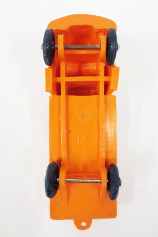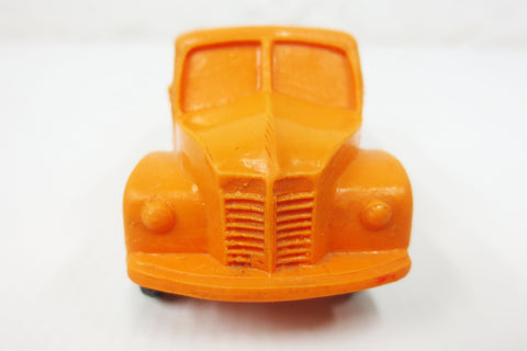 Excellent condition, very clean. Rare rubber toy truck signed Tomte Laerdal Stavanger Norway, model #15. Orange 1950's flatbed pickup truck. Opaque windows and moving wheels. Measures 3 3/4 X 1 1/4 inches.