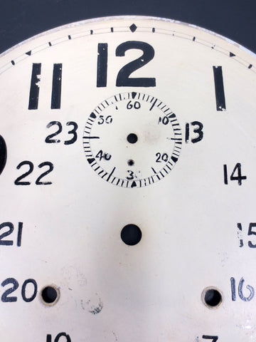 Excellent condition, rare 24hrs hand painted dial on a thick metal back. Large 1-24 numbers and a unique internal seconds dial. Use it as a cool wall clock with a basic clock motor and hands or to restore banjo wall clocks. We found only 3 of these dials.