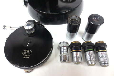 - 4 microscope objectives: Ernst Leitz Wetzlar 1/2 Oel, Carl Zeiss PH1 10/0.22, Carl Zeiss PH2 25/0.45 and a Zeiss Winkel PH3 100/1.30 Oel.