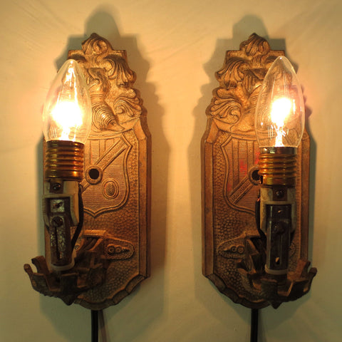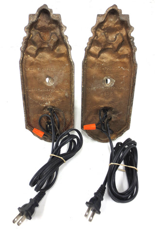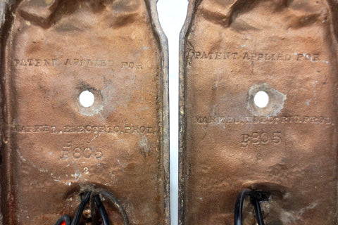 Matching pair signed Markel Electric B 805, rewired and ready to plug in. Antique electric wall sconces with rare artwork of an armoured knight and crest. Heavy cast iron, each wall base measures 10 3/8 X 4 with an arm that extends 4". Working and original on/off switch. Clean, no cracks, original and safe porcelain sockets that support standard light bulbs up to 100 Watts. Each sconce has its own power cord, pair can also easily be relayed. Height of socket is adjustable and you can add the candle covers of your choice.