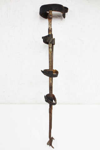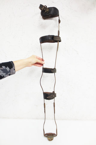 Complete with 4 original leather straps and belts, top section swivels, brass foot rest and anchors. Authentic 1900's horse leg prosthesis, 3 feet tall, 5" wide. High quality construction with brass parts and a metal frame that was once nickel plated (traces still visible). Very sturdy, untouched, leather protected with beeswax. Weighs Rare orthopedic oddity from a private collector in Montreal, Quebec, Canada. Total weight 1.37 Kg.
