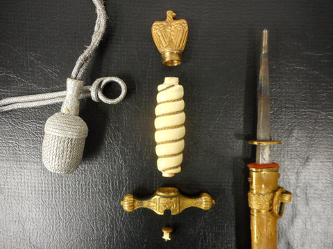 Excellent condition, original brass sheath and decorations. 9 3/4 inches long double sided blade in mint condition, no edge, never sharpened. Total length is 16.5 inches. Dagger was used during WWII German navy military ceremonies. Sheath is covered with hand engraved leafs and crowns and has two uniform fixation rings. Sheath and blade have a sophisticated locking mechanism. Handle guard is very ornate and has a boat anchor on both sides. Handle is white resin with a gold metal spiral. The dagger's butt has a sculpted eagle sitting on the German army emblem.
