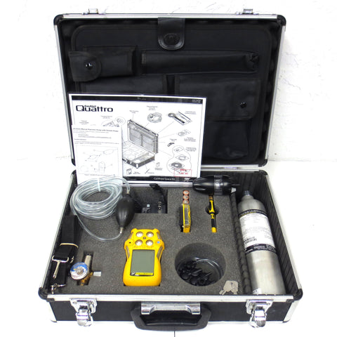 Fully functional and calibrated Gas Alert Quattro multi gas detector set by BW /  Honeywell. Includes all standard accessories and more: 1 rechargeable battery pack with charger, 1 battery pack that works with 3X AA batteries, heavy duty case with 2 keys, Gamic-AS02 manual aspirator pump with sampling probe, calibration cap and gas regulator, battery pack screwdriver, hoses and  instructions manual. All accessories and case are very clean, detector unit has a bright 1 5/8 X 2 inches digital screen, light scratches only. The unit's language and start message can be personalized using an IR link or MicroDock II station. Calibration gas test bottle shown on photos is not included due to customs regulations and can easily be replaced. Case measures 18 X 13 X 6 inches, total weight 9 pounds.