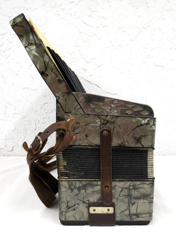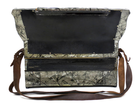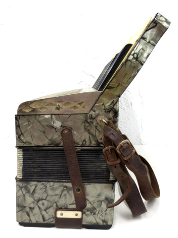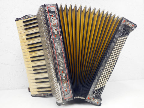 Excellent condition, complete with its original leather straps, signed Angelo Moressi. Plays well, very clean, no broken parts. Made in Italy in the 1930's. This professional antique accordion has 120 bass buttons and a 41 notes keyboard. No case, will be shipped in a sturdy waterproof box. Black and silver mother of pearl twirls with red and white flower appliques, silver front grill. Original yellow and black bellows, repairs made to prevent air loss. Keys are clean, aligned and complete. Measures 20 X 15 3/4 X 21 inches.