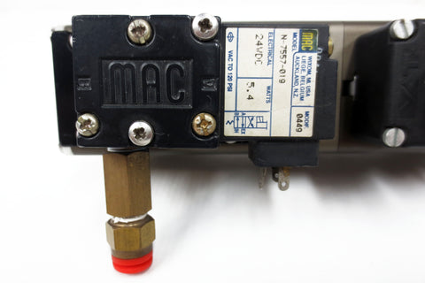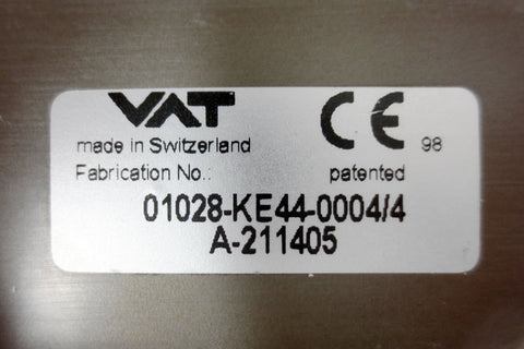 Excellent condition, functional, inspected and clean. UHV pneumatic gate valve by VAT, Switzerland. Model 01028-KE44-0004/4, serial A-211405, with a MAC N-7557-019, 24 VDC, 5.4 Watts, VAC to 120 PSI module. Measures 10 1/2 X 3 3/4 X 2 inches and weighs 2.2 kg.