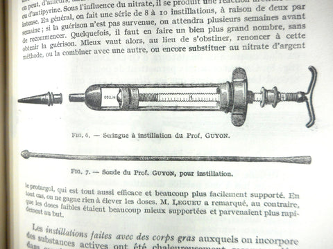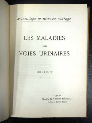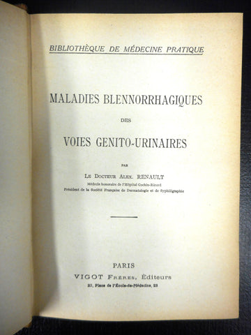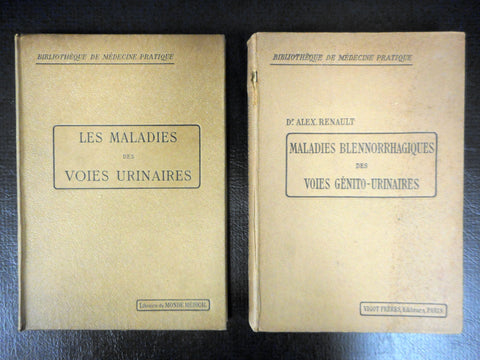 Both books are in excellent condition, complete, published in the 1920's by Vigot Freres, Paris. Both books have sturdy bindings and include beautiful black and white illustrations and advertisements. Written in French by Alex Renault M.D. and several other French specialists, entitled Blennorragiques Diseases of the Genitourinary Tract (262 pages) and Urinary Tract Diseases (152 pages). Books were owned by Doctor Jacques Fortier, renowned doctor and author from Montreal (Quebec, Canada) in the early 1900's. One of the book is signed by him. We acquired his private collection of antique medical books.
