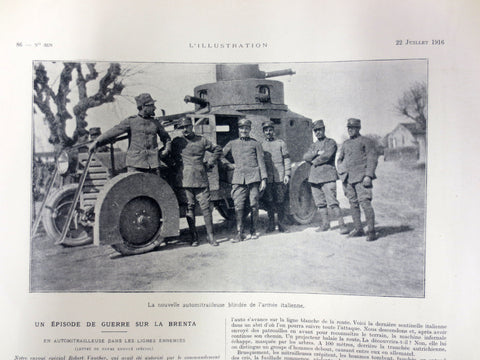 French magazine dated July 22, 1916, during the WWI Battle of Verdun. Large size 16 X 12 inches. 26 larges pages filled with War photos and French Advertising. 4 large color illustrations of Generals Petain, Nivelle, Foch and D'Urbal. Large two tone photographies of Colonel Driant, Petain in his train wagon office and the commander of the French Army Césaire Joffre. Numerous artillery and war zone photos. A large 4 pages booklet listing deceased soldiers and their stories. Filled with beautiful French advertising such as Longines watches and pharmaceuticals. Newspaper is in great condition however missing pages.