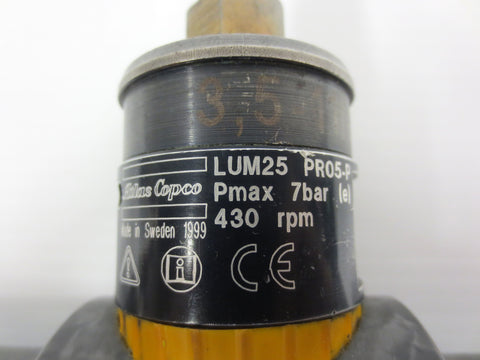 Excellent working condition, very clean. This push to start LUM25 PR05-P aircraft 1/4" Hex pneumatic screwdriver/nutrunner was made by Atlas Copco in Sweden. The T Bar can easily be removed as needed. Air coupler included. Specifications: 430 RPM, Forward/Reverse, 7BAR, 3.5-11Nm, serial A178043. It has hand engraved identification on it.
