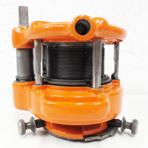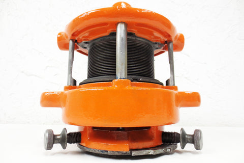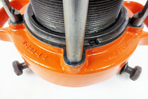 Very clean, serviced, ready to use, pdf manual included. Heavy duty jam proof pipe threader size 2 1/2" to 4" by Ridgid, model 4P-J, B-186-1 J, made in USA, Complete with its original 3" 4-P Ridgid dies #1 to 5. Has a self open dies universal head, bottom gage plate and its original fixation bolts. Weighs 59 pounds, measures 13 x 12 x 10 inches.