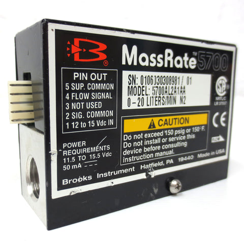 Fully functional, original tags, very clean. Installation and operation manual included (46 pages PDF). Electronic flowmeter by Brooks Instrument, model MassRate 5700. Flow range 0-20 liters/min. Up to 150 psig. Temperature limit 5 to 65°C. Power 11.5 to 15.5 Vdc, 50 mA. Model 5700AL2A1AA. Pre-owned and tested industrial surplus from a closing plant in Quebec, Canada. Minor surface scratches only.