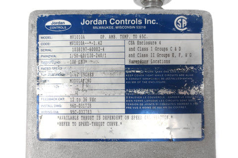Like new condition, inspected and functional. Jordan Controls LowFlow valve model 708MV with a Jordan electronic modulating actuator model MV1010A. Valve specifications: 3/4 inches, Max 4000 PSI, Range 4/20, CV 2.0. Fixation bracket already installed. Valve serial 1028083A. Measures 21 X 7 X 6 inches and weighs 21 pounds.