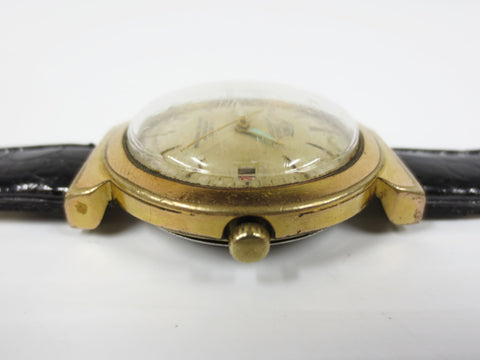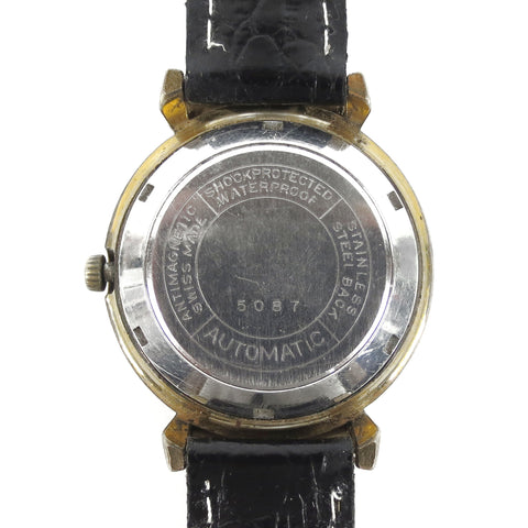 Fully functional and keeps time. This is a rare Technos Automatic watch from the 1940's. It has a thick gold filled case with a stainless steel back cover marked "Automatic 5087, Antimagnetic Swiss Made". Fancy case, large lugs. Its automatic movement has a rose gold tint and is marked "30 jewels Swiss Made T Adjusted, F692". Crystal and dial are in excellent condition. New leather band.