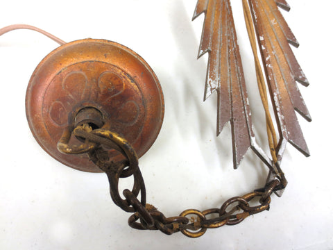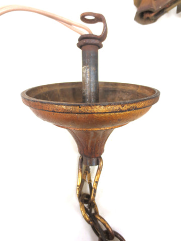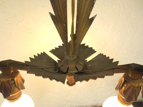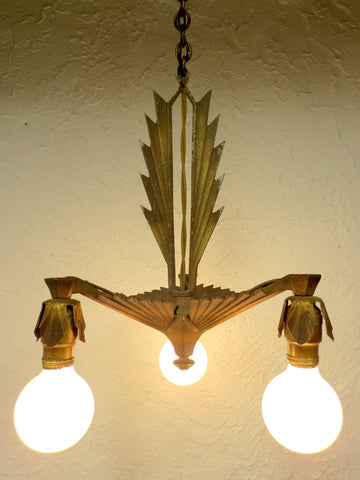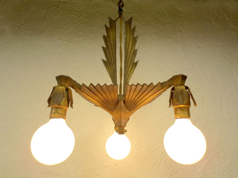 Spectacular, working, ready to install, excellent condition. 11" diameter. Original gold color, beautiful patina, heavy cast iron. Great Art Deco geometric design. Original and clean Halebro sockets surrounded by petal ornaments. The ceiling dome, chain and bracket, as well as the three 40 watts light bulbs are included.