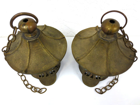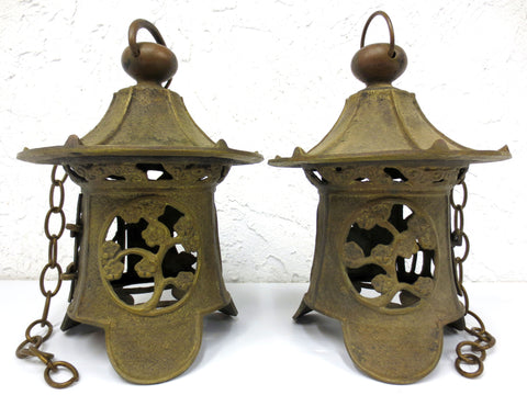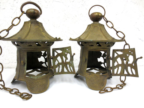 Antique Japanese Lanterns Pair 12" Heavy Brass, Buddhist Temple Lanterns, Chains