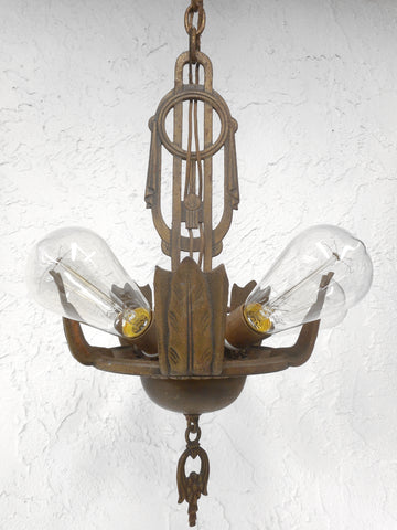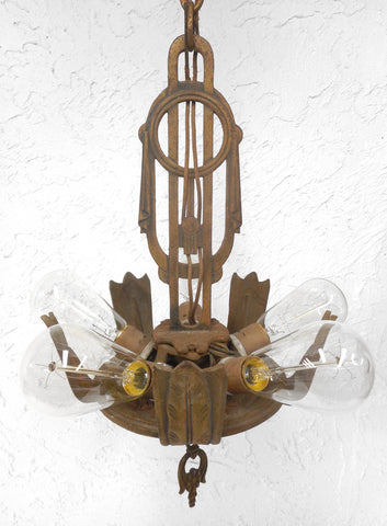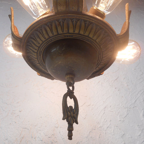 All original, beautiful leafs and flowers design. Ready to install, excellent condition. Signed Electrolier Montreal. 26 inches tall, 13 inches diameter with light bulbs. Original chain and ceiling hook included. All cast iron, gold finish in excellent condition. 5 new Edison style light bulbs included.