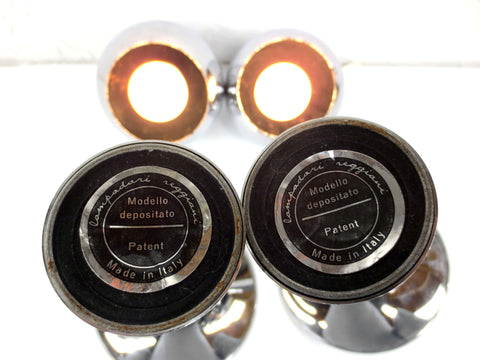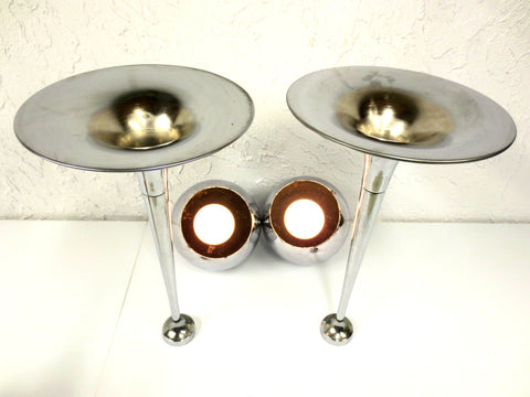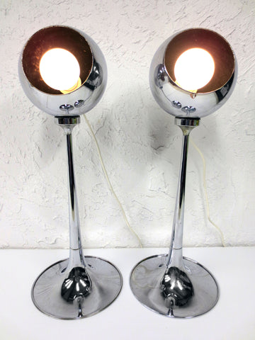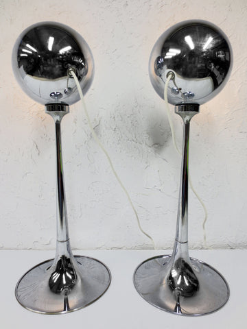 Spectacular chrome sphere lamps on wide stands. Both have their original Lampadari Reggiani Italy tags. Each lamp measures 2 feet tall and has a 9 inches diameter base. Chrome balls are magnetic, pull to remove and place at the angle of your choice. No dings, chrome in excellent condition, very light wear. Long and clean white wires, round light bulbs included. Supports up to 75 watts light bulbs.
