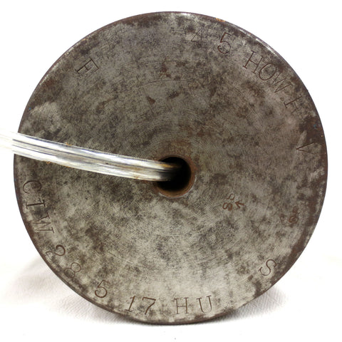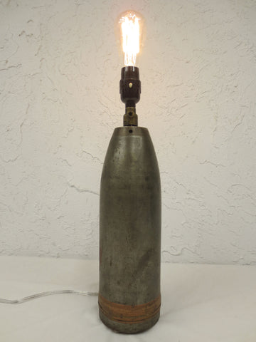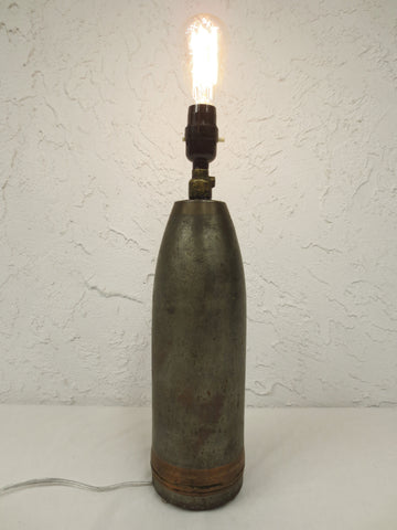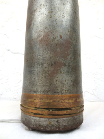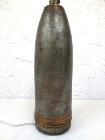 Authentic 1940's brass shell, 18" tall lamp, ready to plug in. On/off switch, new wires, Edison style light bulb included. Shell base has a 4.5 inches diameter and is identified "45 HOW R V CIW 25 5 17 HU". Base is solid brass and very heavy which will increase shipping cost. Great military industrial lamp for your man cave or living room.