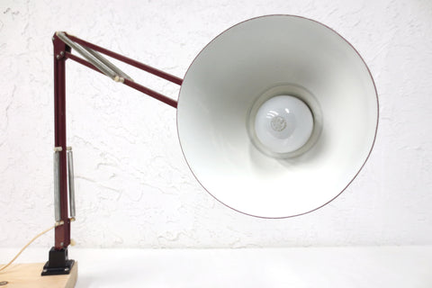 Excellent condition, very clean, ready to plug in. Rare original dark red/burgundy paint. 6 3/4 inches diameter shade embossed with the Luxo signature. Long double 31 inches articulated arm with springs and knobs to adjust it to your taste. Has a verstile base that can be screwed on a wall or desk, vertically or horizontally. Base and screws included. Supports standard light bulbs up to 100 Watts (not included). Cool lamp for your home or office desk, classic design and space saver.