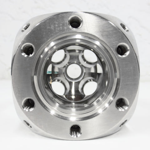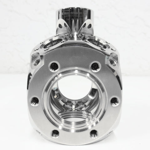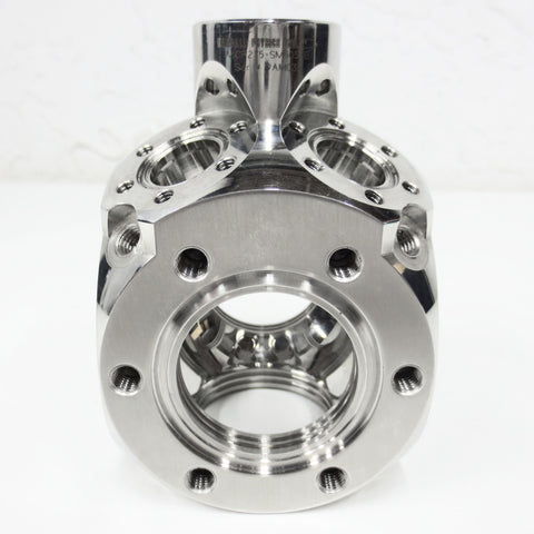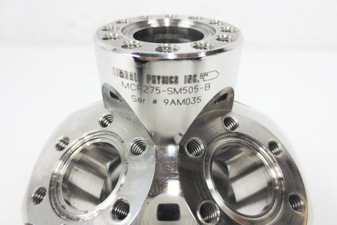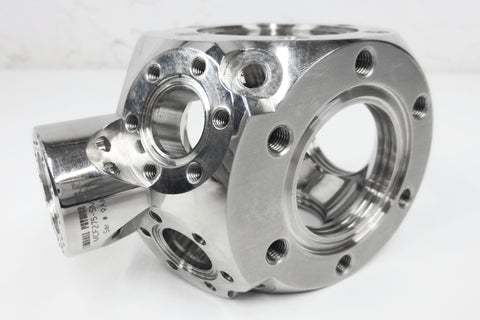 Excellent condition, very clean, no chips, no dents. Thick high quality stainless steel. Surplus from a cryogenics laboratory. Spherical cube vacuum chamber by Kimball Physics, fits 2.75" CF (5) and 1.33" CF (5). Model MCF275-SM505-B, serial 9AM035. Measures 2.75 X 2.75 X 4.25 inches and weighs 1.29 kg.