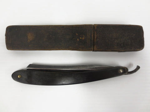 Antique Wade and Butcher Sheffield England 7/8 hollow ground straight razor for barber's use. Blade is intact, has no rust and is still sharp. Its tang has a hallmark and the blade has a massive spine. Horn handle is sturdy and in good condition. It measures 10 inches open. Found in a beautiful Sheffield box with embossed flowers. Box is still very sturdy.