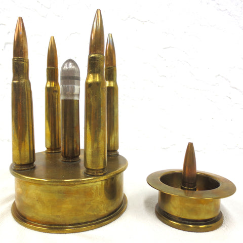 Mint condition, well built, lighter works. Spectacular 7 inches tall lighter with a 4.5 inches diameter. Base and top are marked "105mm M14, 1944, Type I, ECBC-333". Lighter has a removable cover and a large reservoir. Matching ashtray, 2.5 inches tall, 3 inches diameter. Marked "40mm M25, 1943, Lot 149".