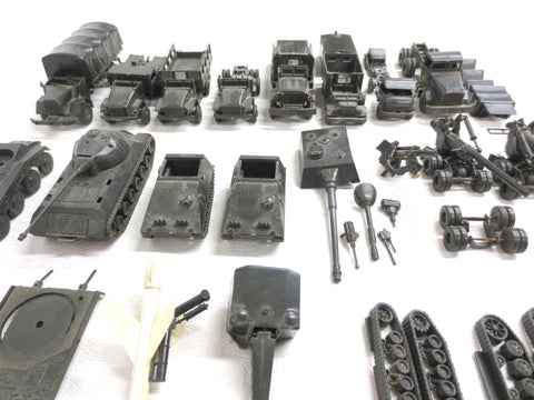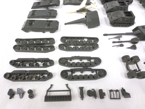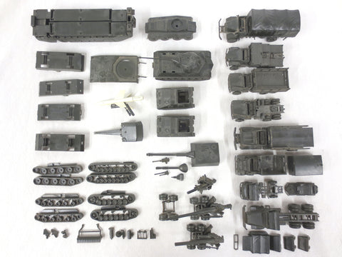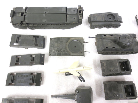 No broken parts, all DBGM ROCO army tanks and truck parts from the same time period. Pieces inspected one by one. No complete vehicle. Includes 8 tank cannons, 4 matching tank wheels, 8 army trucks, 1 Alligator amphibious bridge truck (no crane), 4 tanks, 4 truck roofs, wheels, 1 large rocket and more. See our store for more ROCO, RMM and Aurora military vehicules from the same private collection.