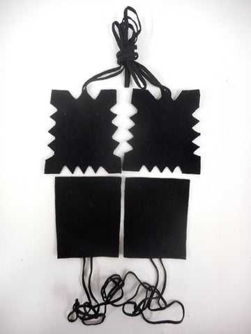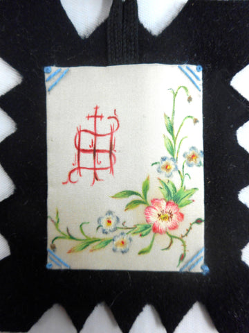 All 4 necklaces are in mint condition, no stains, no color loss. Each one is hand painted and embroidered on silk and supported by black felt. Beautiful drawings of flowers, leaves and Gothic religious emblems. These were found in rural Quebec and were worn by pilgrims during marches and ceremonies. One pair measures 2 3/4 X 2 1/4 inches and the other 2 3/4 X 3 inches.