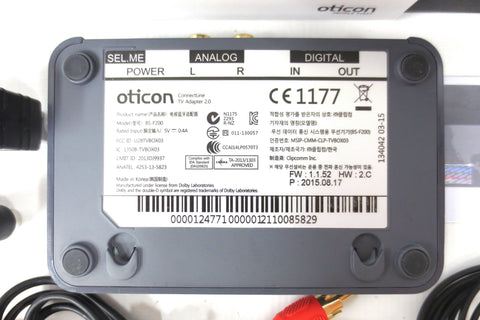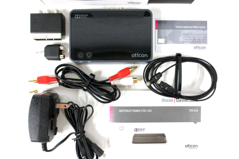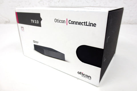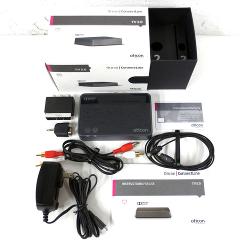 New, open box, complete with instructions, warranty and all its original accessories and cables. TV adapter for hearing aids by Opticon ConnectLine, Model TV 2.0. Ready to use. Unused surplus from a medical center in Montreal (Quebec, Canada).