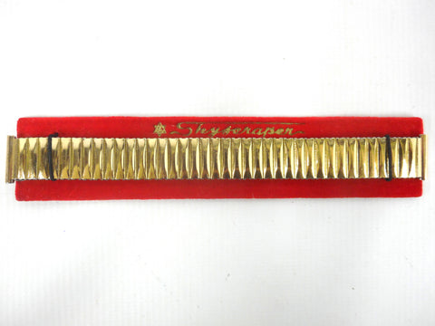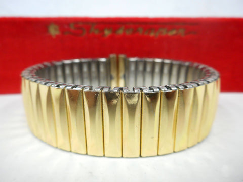 Perfect condition, from the 1960's, never used (New old stock). For 17 mm watches. Still on its original Skyscraper display felt. Extensible watch band with a cushion pattern in the middle. Golden metal and stainless steel back. 6 1/8 inches long. Will complete and refresh the look of your vintage watch.