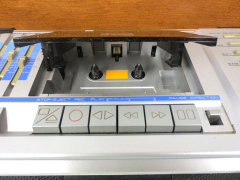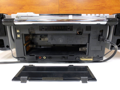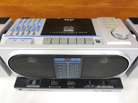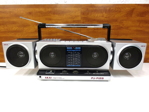 Excellent working condition, very clean, all original with tags. Powerful and compact 1980's Akai portable 4 band stereo cassette receiver with 2 detachable and swiveling speakers. It has a 5 bars graphic equalizer, a cassette deck and a 4 bands receiver FM, MW, SW1 and SW2. Comes with its original electrical wire and also works 8 batteries (1.5 volts, not included). Battery compartment is very clean. This is Model PJ-R25FU, serial number 10339-00338, Made in Japan. Dimensions: 22 3/4 X 7 X 6 1/2 inches.