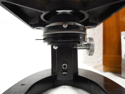 Signed K.O.C. Kinei Tokyo No. 17383. Original dovetail wood box with key and a yellow metal tag marked "Dept. of Munitions and Supply Ottawa, Joint Property Canadian & British Governments Contract No 1207W, Item No. 1227". Comes with a custom made metal box with a blue filter. Measures 11.5 inches closed, 14.75 open.