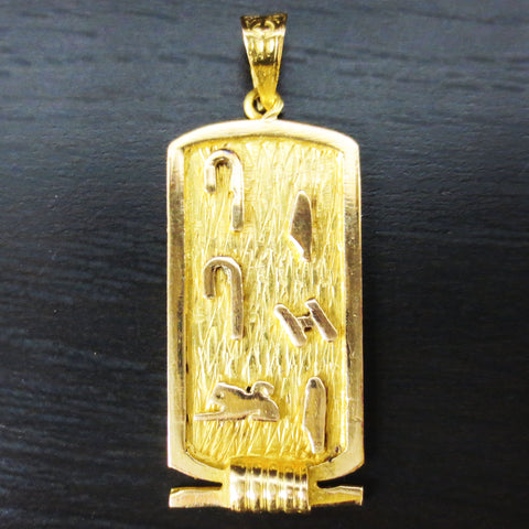 Excellent condition, complete with felt pouch and jewelry coordinates in Cairo, Egypt. Beautiful 18k yellow gold hieroglyphic cartouche pendant, measures 5/8 X 2 1/8 inches (15 X 32 mm), weighs 5.5 gr.