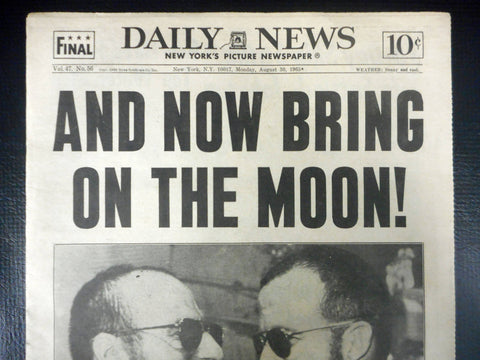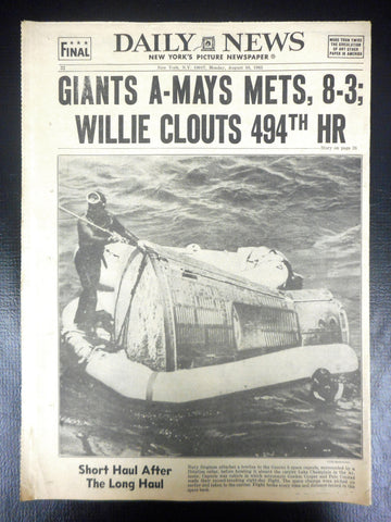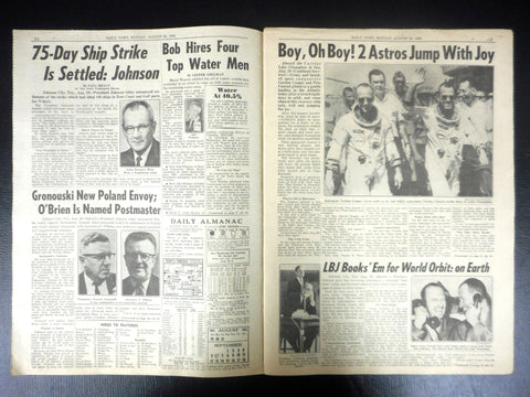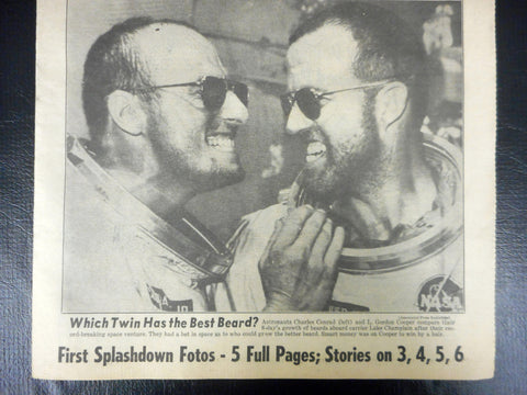 All pages in excellent condition, no folding marks. This is the New York's Daily News Picture Newspaper dated August 30th 1965. Main feature is the Apollo mission of Astronauts Conrad and Cooper. 8 days' journey in orbit 120 times around the earth, longest journey in space by men, in preparation of the mission to the Moon. This is a partial copy which includes pages C1 to C6, C13 to C18 and C31. Excellent condition, was stored in a plastic sleeve for decades. Measures 15 X 11 inches.