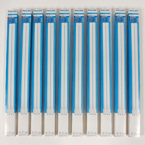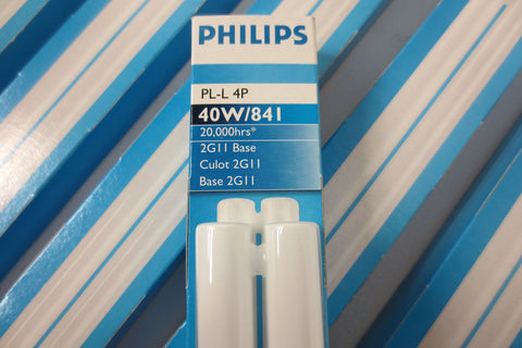 21 brand new Philips fluorescent light bulbs, 40 Watts, 3300 Lumens 20,000 Hours, 2GII base, 4 pins, model PL-L 4P 40W/84I. Surplus from an electrical company in Montreal, Quebec, Canada.