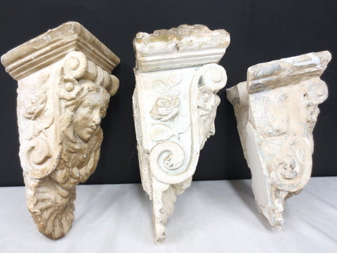 Matching set of 3, salvaged from a Victorian home in Quebec, Canada. Authentic, unrestored, original patina preserved. They each measure 9 to 10 inches and are 5 inches wide. These unique corbels are still sturdy but do show chips and cracks. Ideal for a fireplace, living room shelves or to enhance your ceiling.