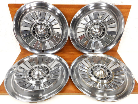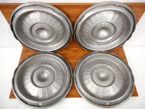 4 original and matching chrome hub caps for a Ford Mercury Meteor 1957 to 1959. All marked Meteor, very clean, black paint still visible. No broken or missing parts, they show dents due to age and use. Great for car restoration or as wall decor for your man cave or garage.