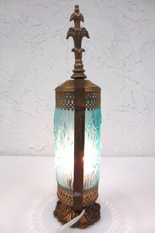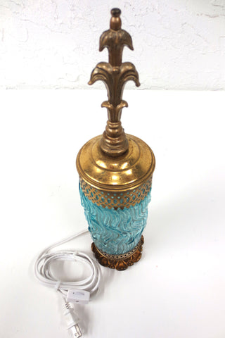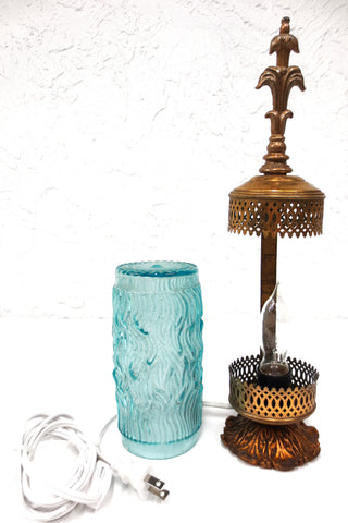 Beautiful blue glass dome with embossed waves, gold tone cast iron and metal body. Rewired, long power cable and on/off switch, light bulb included. Supports standard light bulbs up to 100 Watts and plugs into a standard A type outlet. Measures 14.5 inches tall, 3.5 in diameter and weighs 1.06 kg.