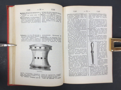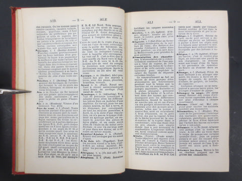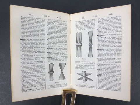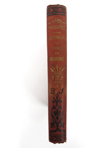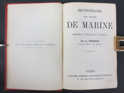 Pocket size 3.75 X 5.5 inches, original and complete, sturdy binding. Many very detailed illustrations. Written in the 1890's by A. Poussart, a retired naval officer and published by Garnier Frères in Paris. French edition. Beautiful "Jolicoeur" hand signatures on the first pages. Entitled "Dictionary or Nautical Terms, Sail and Steam Marine". In French "Dictionnaire des Termes de Marine, Marine à Voiles et à Vapeur".