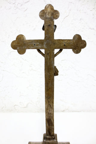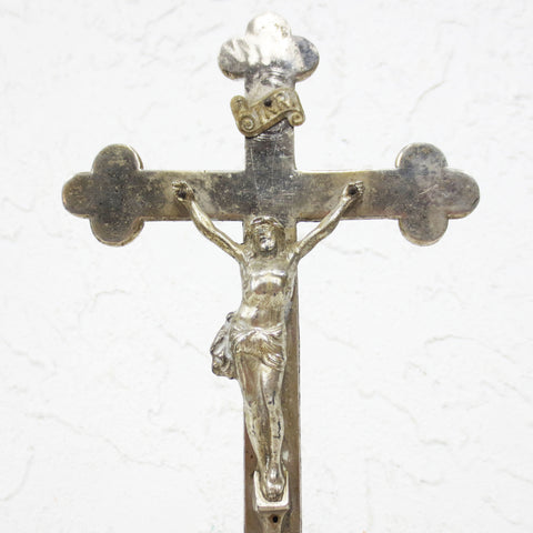 Antique church tabernacle crucifix made in Germany. 12 inches tall, nickel plated, standing. Embossed Arma Christi signs on back (Instruments of the Passion): Crown of thorns, ladder, hammer, nails, cock, pincers, spears, flagellum, pitcher of gall and vinegar and dices. Original patina preserved. From a closed rural church in Quebec, Canada.