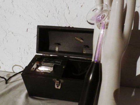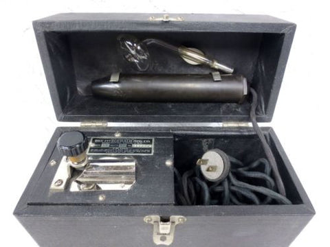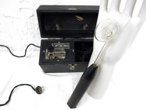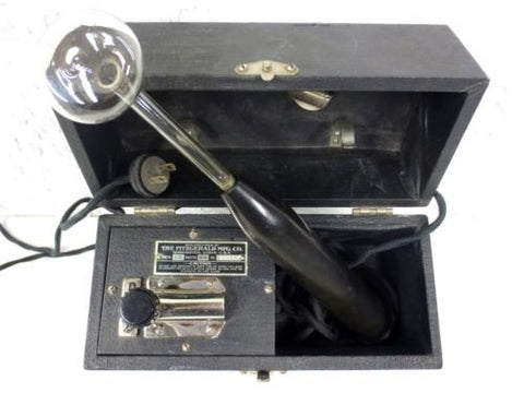 Perfect condition, fully functional. Wand measures 13" long. Both electric cords and plug show no trace of use. Glass and bakelite in great condition. Knob allows precise control of electricity. Box measures 10 X 7.5 X 4.5 Inches and is also in excellent condition. Device doesn't seem to have been used much. Marked "Fitzgerald MFG, Torrington, Connecticut, U.S.A., 110 Volts, 28 Watts, No 38320".