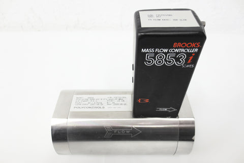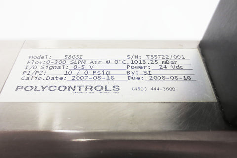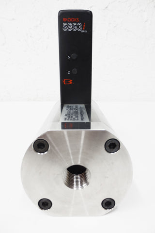 Fully functional, original tags, very clean. Mass flow controller for air by Brooks Instrument, model 5853 i Series. Flow: 0-300 SLPM Air @ 0°C, 1013.25 mBar. Gas: Air. I/O signal: 0-5 V. Power: 24 Vdc. P1/P2: 10/0 psig. 1500 psig max. Base is model 5863i. Pre-owned and tested industrial surplus from a closing plant in Quebec, Canada. Minor surface scratches only.