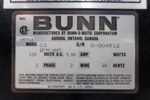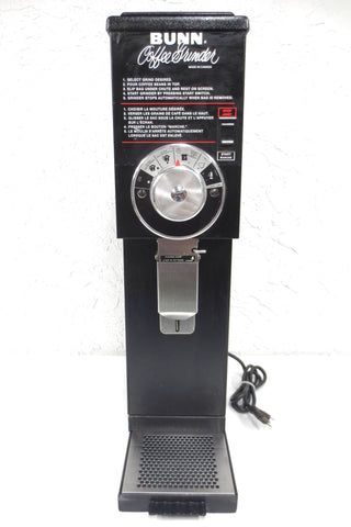 Excellent working condition, serviced, very clean. Bunn G3 commercial coffee grinder model 22100 6003, serial G-004512. Coffee grinding settings: Coarse, regular perc, electric perc, drip and auto drip (for filter coffee machines), fine, espresso and Turkish. Specifications: 120 Volts, 9.00 Amp, 1 Phase, 60 Hertz. Measures 7 X 27 X 15 3/4 inches and weighs 50 pounds.