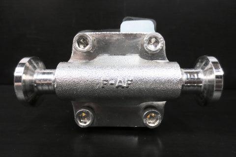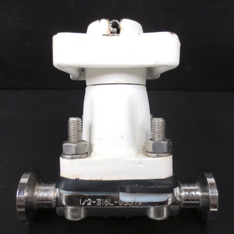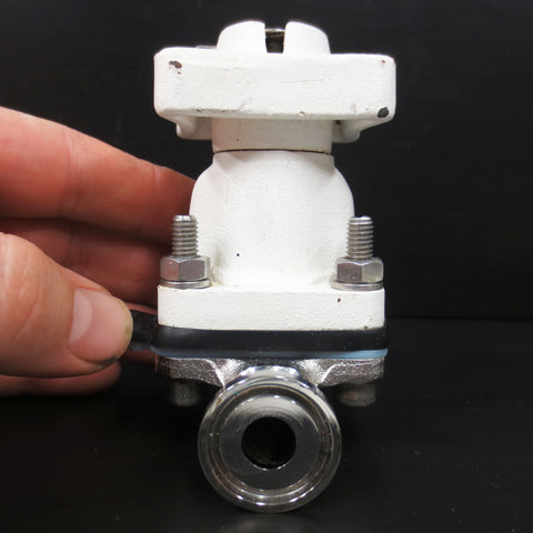 Very clean, inspected and functional. Diaphragm valve by Burkert, 1" outside and 3/8" inches inside diameter flanges, model 1/2-316L-03579, F-AF. Measures 3 1/2 X 3 5/8 X 2 inches and weighs 733 grams.