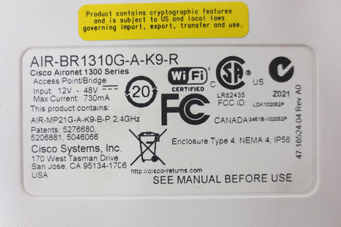 Fully functional, very clean, double coaxial and cat 5 cables included. Cisco Aironet 1300 series 54 Mbps wifi outdoor access point model AIR-BR1310G-A-K9-R with a Cisco Aironet power injector LR2 model AIR-PWRINJ-BLR2. Light scratches only, no power cables included. Surplus industrial electronics from a telco in Montreal (Quebec, Canada).