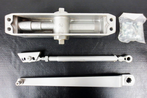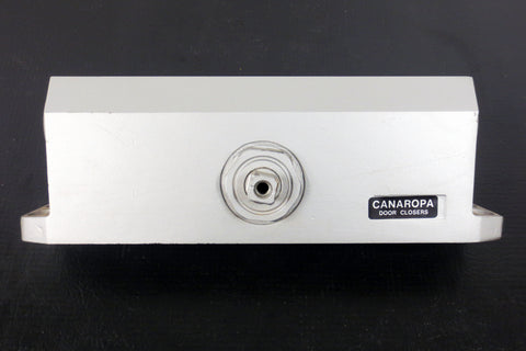 New, open box, hardware bag still sealed. Compact door closer model 63 by Canaropa, reversible from left to right, aluminum constructions. Total weight 2.3 kg, box measures 12.5 X 3.5 X 4 inches.