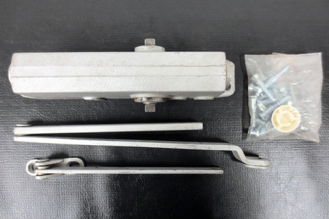 Clean, ready to use, open original box, hardware bag still sealed. LCN door closer model 1072 by Ingersoll Rand. Regular arm, high quality aluminum, light scratches on arm. Weighs 7.5 pounds total, box measures 12.5 X 3 X 5 inches.