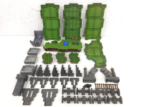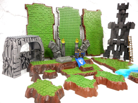 All parts are clean, excellent condition, none broken. All identified Mega Bloks pieces. Includes 8 green terrain plates (1 has blue water), 2 arches with yellow flames and ancient markings, 24 grey medieval castle parts with 1 gargoyle and 4 grey rock parts. Also 1 gold knight, 2 shields and flag included. Useful parts to complete or enhance you Mega Bloks set.