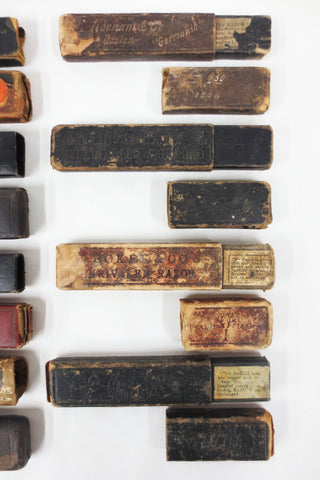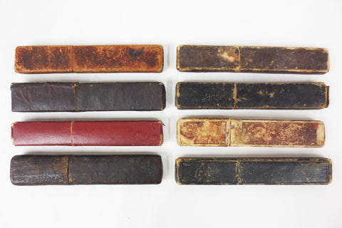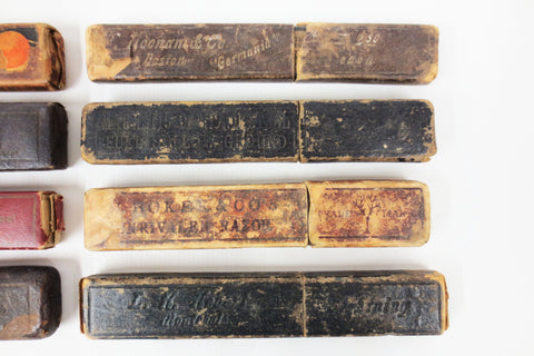All 8 boxes are signed and identified: D-Pont Côte d'Azur, Canadian King, Reico, Anchor Razor, Noonan Germania, Magnetic Diamond Steel Full Hollow Ground, Boker Unrivaled Razor and L.H. Hebert Montreal Lightning. Both parts of each box match and are original. All boxes open and close easily without being loose. Great for collectors who have loose matching straight razors, increases their value. Can also be used as wall decor in your man cave or salon.