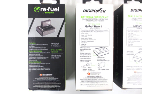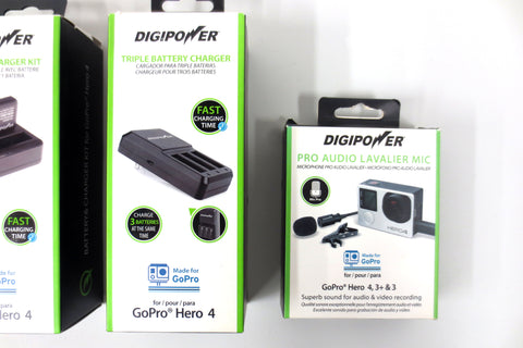 All 4 DigiPower kits are new, includes 2 battery & double charger kits for GoPro Hero 4, 1 triple battery charger for GoPro Hero 4 and 1 microphone pro audio lavalier for GoPro Hero 3, 3+ and 4.