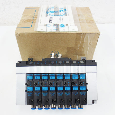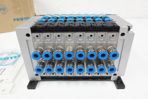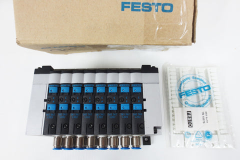 New, open box, perfect condition. 8-way valve terminal block by Festo, model CPV14-GE-FB-8. 4 unopened strips of tags and original box.